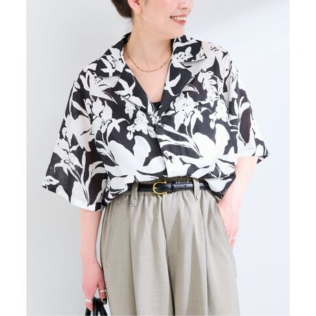 アートプリントオープンカラークロップシャツ(品番:25050700141020)のアップデートで、衿や前下りを去年より女性らしく仕上げました。イングランドとスイスの図案メーカーのプリント3柄を採用し、筆で無造作にストロークしたような柄が抽象的で大人っぽい雰囲気。麻混のセルロース素材を使用し、シアー感とナチュラルな質感がありながらもドレープ性も強い素材になっています。着丈を少し出し、全体的に細身にしているのですっきりとしたシルエットになっています。