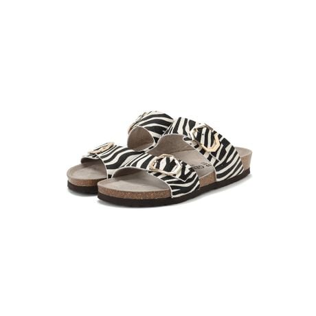 解剖学に基づいたフットベッドを採用し、独自のバックルで調節可能なアニマルプリントレザーサンダル。柔らかな起毛が自然な風合いを引き立てます。