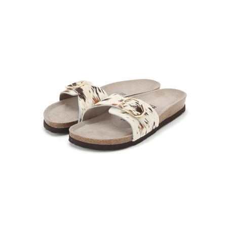 解剖学に基づいたフットベッドと、独自のバックルによる調節可能なフィット感を備えた、アニマルプリントレザーサンダル。柔らかな起毛が自然な質感を際立たせています。