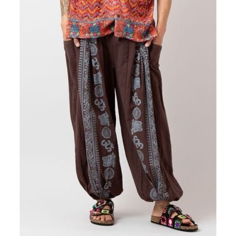 【タイ直輸入】OM(オーム)モチーフのラインプリントが目を惹くメンズパンツ。リラックス感のある、ゆったりシルエット。