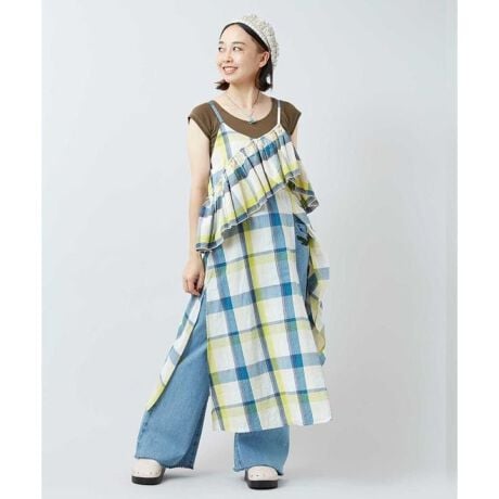 [型番:IMC-6107-2026]インドの伝統衣装「サリー」から着想を得たワンピース。南インド伝統のマドラスチェックと金糸を織り込んだデザイン。裾のストリングでアレンジ可能な変形シルエット。軽やかで個性的なスタイリングが楽しめる一着。