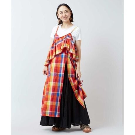 [型番:IMC-6107-2026]インドの伝統衣装「サリー」から着想を得たワンピース。南インド伝統のマドラスチェックと金糸を織り込んだデザイン。裾のストリングでアレンジ可能な変形シルエット。軽やかで個性的なスタイリングが楽しめる一着。