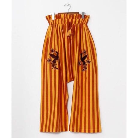[型番:IAC-6136-2026]インド綿のやさしい肌ざわりと、オトミ族の刺しゅうモチーフが魅力のストライプパンツ。ゆったりシルエットに、ウエストのフリルで女性らしさも演出。同シリーズのトップスと合わせて、セットアップで着るのもおすすめ。
