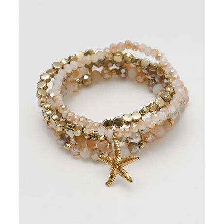 [型番:42CZ6201-2026]スターフィッシュモチーフをポイントにした5本セットブレスレット。海を思わせるターコイズカラーと砂浜のようなベージュが手元を爽やかに彩ります。ゴム仕様で着脱しやすく、重ね方次第で表情が変わるのも魅力。その日の気分で自由にアレンジを楽しめます。