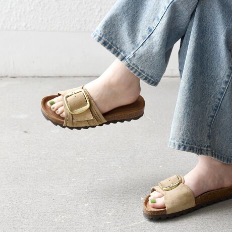 大きめのバックルとワンストラップデザインが目を惹くフラットサンダル。