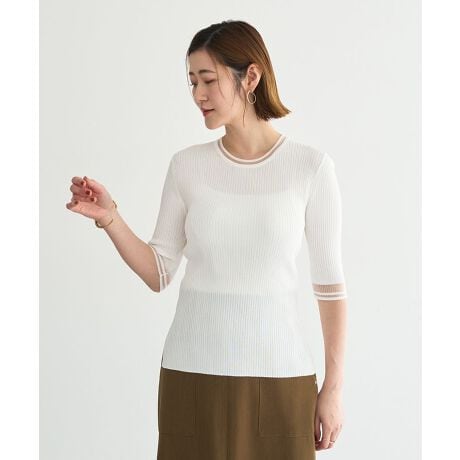 リブニットの端正な表情にシアー素材を掛け合わせた、人気の五分袖トップス。