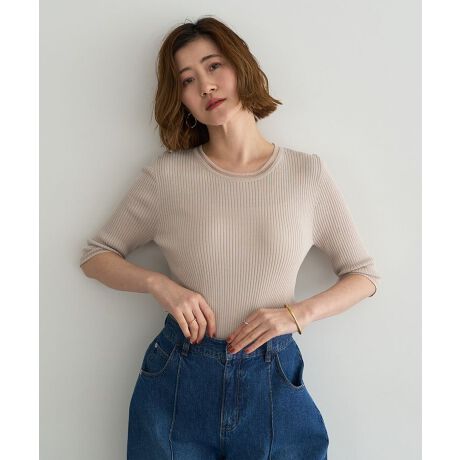 リブニットの端正な表情にシアー素材を掛け合わせた、人気の五分袖トップス。