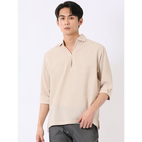 大人のカジュアルスタイルにぴったりな、7分袖のカプリシャツです。剣先が外に大きく開くカッタウェイ、すっきりとしたスキッパー、ループ留めのボタンがポイント。上品で清潔感のあるルックスと着心地の良さを兼ね備えた一枚です。