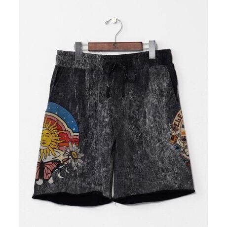 【タイ直輸入】両サイドにプリントされた月と太陽のモチーフが目を惹くメンズハーフパンツ。ヴィンテージ感ある風合いとヒッピーな空気感が絶妙にマッチ。ラフなシルエットで履き心地も抜群。個性を出したいスタイルにぴったり。