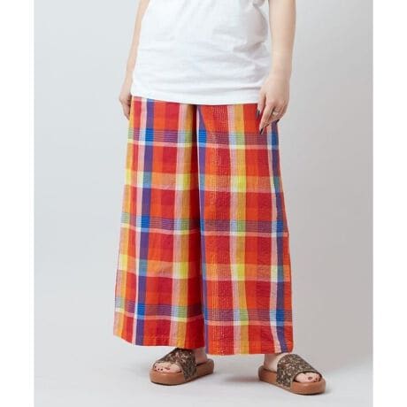 [型番:IMC-6109-2026]インドの伝統衣装「サリー」から着想を得たレディースパンツ。マドラスチェックに金糸が上品に織り込まれたデザイン。ワイドシルエットで体型カバーが可能。バックポケット付きで実用性も兼ね備えた一着。