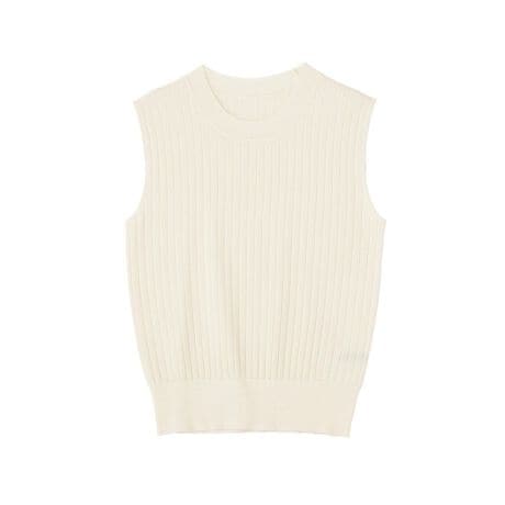 すっきりとしたシルエットとリブ編みの縦ラインが、自然にスタイルアップを叶えてくれるノースリーブニット。