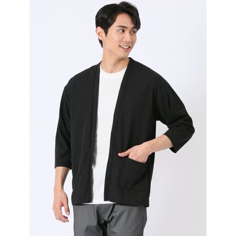 カーディガンは薄手のポリエステル素材です。ジャガード織りによる表面感、サラサラとした風合い、軽い着心地が特徴です。インナーの半袖Tシャツ(白無地)はポリエステル・コットンの天竺素材です。