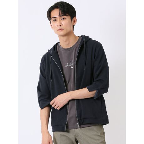 シンプルなデザインで着回しやすい、7分袖のフルジップパーカーです。凹凸感のあるワッフルジャガードで高見えするルックスに仕上げています。すっきりとしたシームポケット付きで利便性にも優れています。