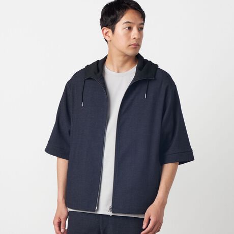 デニムライクストレッチ 5分袖フーデッドブルゾン