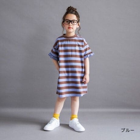 少し太めの先染めボーダーが目を引く半袖ワンピースは胸元のワンポイントロゴと袖フリルがポイント