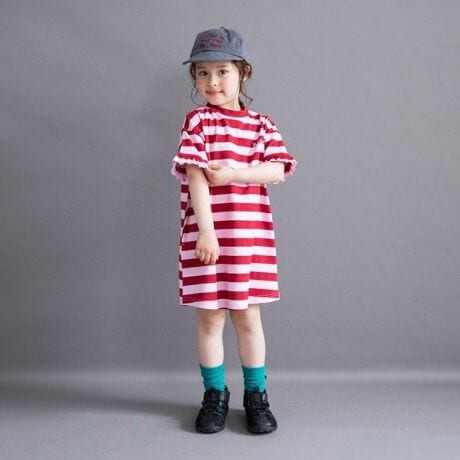 少し太めの先染めボーダーが目を引く半袖ワンピースは胸元のワンポイントロゴと袖フリルがポイント