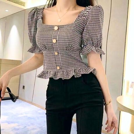 -可愛らしいギンガムチェック柄が魅力のペプラムブラウス。ウエスト切り替えのフレアシルエットでスタイルアップ効果もあり、韓国ガーリーなコーデが簡単に完成します。
