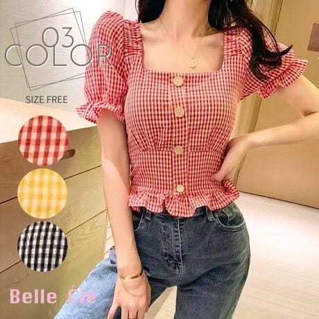 -可愛らしいギンガムチェック柄が魅力のペプラムブラウス。ウエスト切り替えのフレアシルエットでスタイルアップ効果もあり、韓国ガーリーなコーデが簡単に完成します。