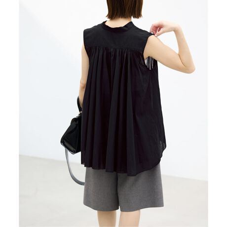 ピンタックのブラウスを腰回りが隠れて程よい揺れるシルエットにしたノースリーブブラウス。