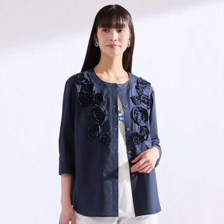 伸縮性に優れた綿素材のブラウス。前身頃に共布素材を使用して花のモチーフを刺繍しています。立体感があり華やかさを添えてくれるアクセントに。