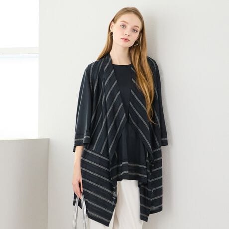ひらりひらりとした衿がエレガンスな表情のドレープ着流しベスト。ウエスト部分でボーダーの柄方向を変えて変化をつけています。