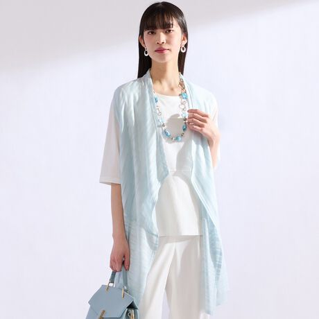 ひらりとした衿にラメ混、シアー感のある素材がエレガントで涼しげな表情。これからの季節にうれしいベストです。