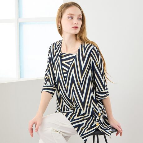 ジグザグのボーダーラインにロープの柄を効かせたお洒落なプリント。シンプルなトラッドマリンにちょっとひねりを効かせたジグザグラインやさりげないマリンのモチーフがかわいらしい。リリアンビューティのオリジナルプリントです。
