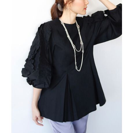 袖フリルと胸下のタックがレディな印象のブラウス。