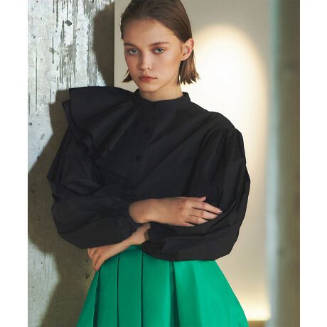 1枚で華やかなアシンメトリーフリルが目を惹く、プチハイネックブラウスです。