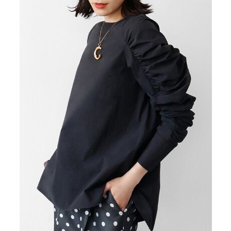 袖のギャザーが大胆なデザインのイレギュラーヘムのブラウス。