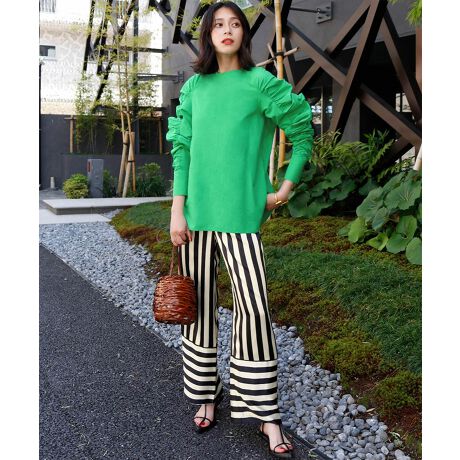 クルーネックデザインにすることで袖のボリュームと身頃とのバランスで華奢見えが叶います。