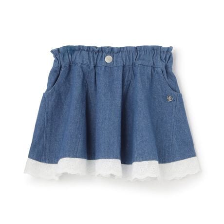 裾のレース使いが魅力的な女の子らしい雰囲気のデニムスカートです。左サイドに添えたハートのメタルパーツが上品なアクセント。ウエストは動きやすく脱ぎはきが簡単な総ゴム仕様です。可愛いブラウスはもちろん、カジュアルなTシャツとも相性良く決まります。【おすすめの着用時期は春夏シーズン】