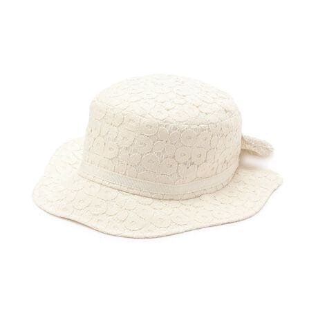 上品な雰囲気がただようアイリッシュレースの帽子です。やさしい色合いの繊細な花柄でアクセントをプラス。印象的なバックリボンは、広げると日除け布に変化します。後ろがゴム仕様のため、頭にしっかりとフィットしてくれるのも魅力です。オーガニックコットンを使用しています。