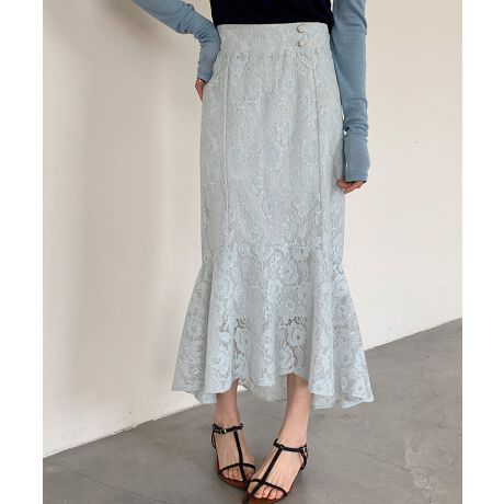 裾のボリュームフリルが華やかなマーメイドシルエのハイウエスト総レーススカート。