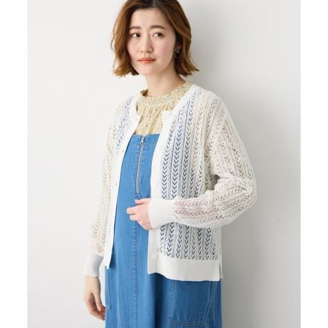 [型番:522427]軽やかに羽織れる透かし編みカーデ透かし柄が目を引く、ハンドクラフトのような表情が魅力のカーディガン。ドライタッチな風合いでさらっと着られ、季節の変わり目にも取り入れやすい一枚です。タンクトップやキャミソールの上にさらっと羽織って抜け感を出したり、ロゴTに重ねてカジュアルに着こなすのもおすすめです。