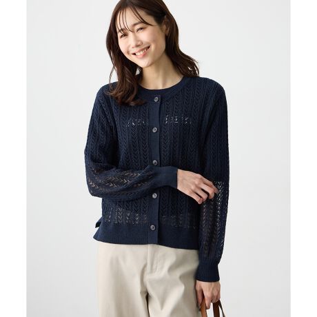 [型番:522427]軽やかに羽織れる透かし編みカーデ透かし柄が目を引く、ハンドクラフトのような表情が魅力のカーディガン。ドライタッチな風合いでさらっと着られ、季節の変わり目にも取り入れやすい一枚です。タンクトップやキャミソールの上にさらっと羽織って抜け感を出したり、ロゴTに重ねてカジュアルに着こなすのもおすすめです。