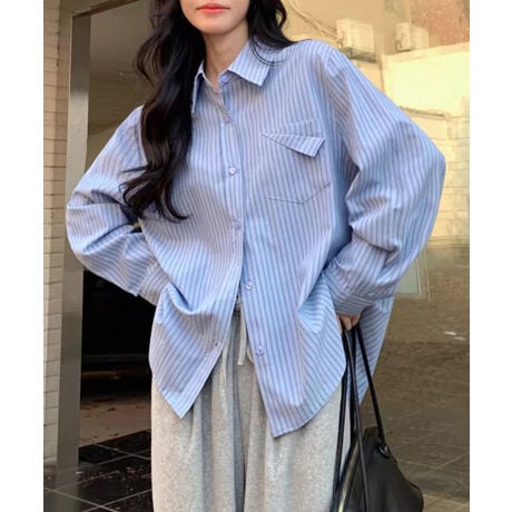 ゆるシルエットで抜け感を演出する、トレンド感たっぷりのストライプシャツ。