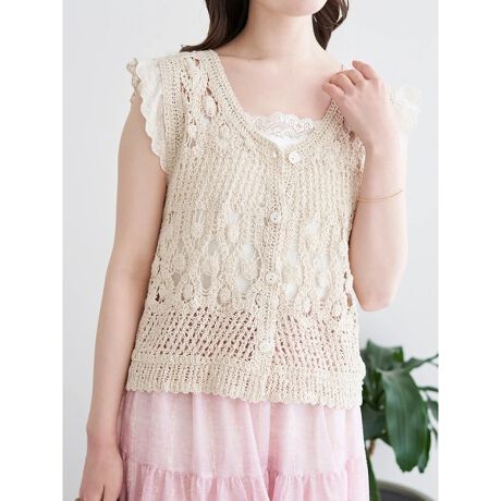 [型番:26550738487]繊細なクロシェ編みとフリルスリーブが目を引くベスト。透け感のある編地で重く見えず、レイヤードで表情が変わるのも魅力です。ブラウスやワンピースに重ねるのはもちろん、タンクトップに合わせて抜け感のあるバランスに仕上げる着こなしもおすすめです。