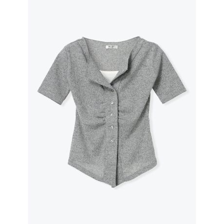 伸縮性のあるリブ素材で体にほどよく沿うフェイクカーディガン。