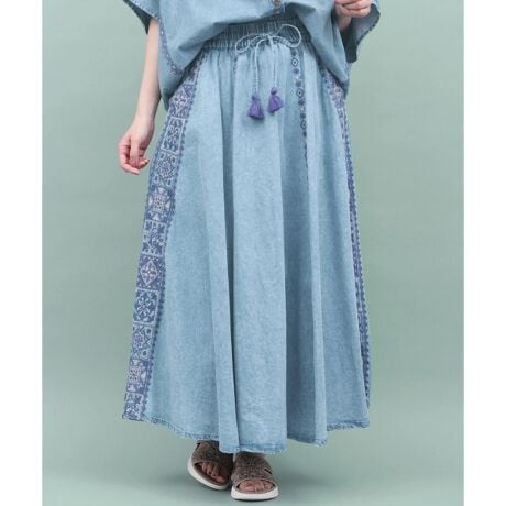 風合いの良いライトオンスデニムを使用し、ウエストゴムのロングフレアスカートに仕上げることで、リラックス感のある大人の抜け感を演出。