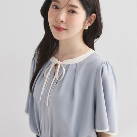 首元と袖口、フロント部分にも配色パイピングが施されており、デザイン性だけでなくすっきり見えも叶うブラウスです。