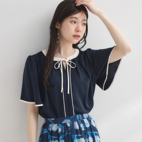 首元と袖口、フロント部分にも配色パイピングが施されており、デザイン性だけでなくすっきり見えも叶うブラウスです。