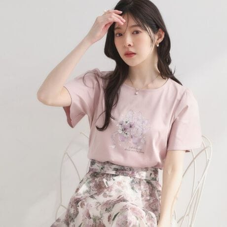 ほんのりフレアスリーブが可愛いクチュールブローチ定番のプリントTシャツです。
