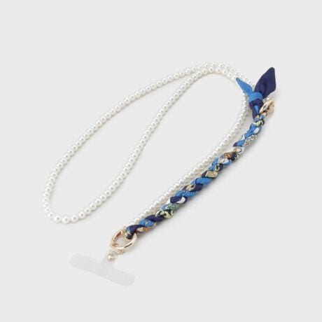 パール調×スカーフ柄と、メタル×ギャザーリボンの2タイプのスマホショルダー。
