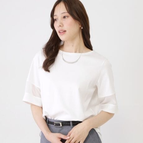 ソフトな風合いが特徴のコットンフライスジャージに袖の一部と裾部分にシアーなシフォンを使用し、歩くたび涼しげな印象に仕上げました。