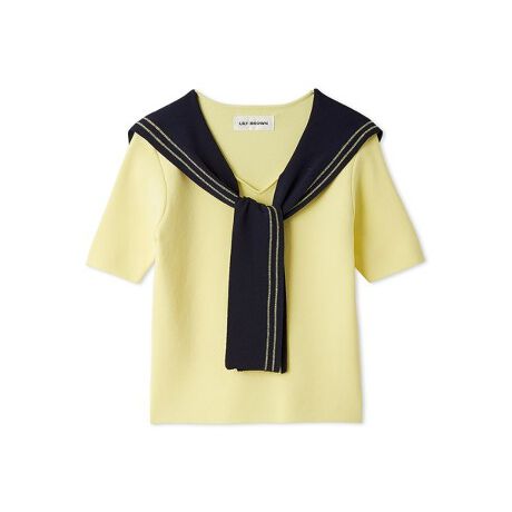 襟とボディに施した絶妙な配色が、「LILY BROWN」らしい個性を放つセーラーカラーニット。襟には2本の刺繍ラインをあしらい、クラシカルかつ清涼感のあるマリンテイストに仕上げました。レイヤード風の襟デザインが顔周りを華やかに彩り、一枚で主役級の存在感を放ちます。裾の両サイドにはスリットを施し、ボトムスにインしてもアウトしても、腰周りをすっきりと見せてくれる計算されたシルエットも魅力。デイリーな装いに季節の彩りを添えてくれる一枚です。