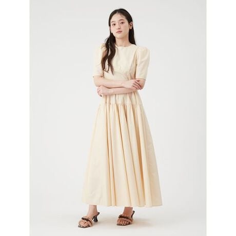 フロントのミニマルな表情と、大胆に開いたバックスタイルのギャップが女性らしさを際立たせるワンピース。袖に施した深めのタックが、愛らしさの中にエレガントな気品を添えています。サイドのリボンでウエストのシルエット調節ができ、自分好みのメリハリのあるラインを楽しめるのも魅力。バックオープンのデザインには、「LILY BROWN Lingerie」のシアーファンデブラシリーズを合わせることで、より洗練されたセンシュアルな着こなしが完成します。