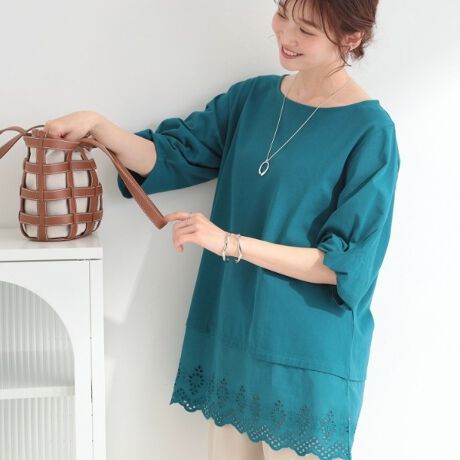 裾には美しい花柄刺繍のアイレットレースを施し、シンプルな中にも上品な女性らしさをプラス。