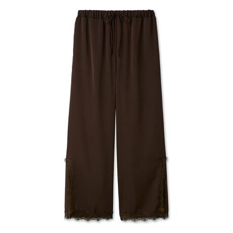 裾と深めに入れたスリットにレースをあしらった、ゆったりとしたラインのロングパンツ。