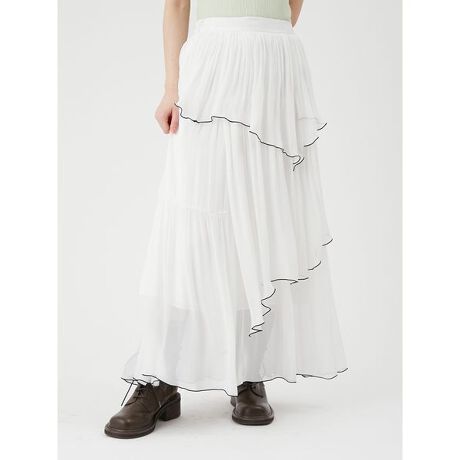 <b>【光を纏うシアーな質感と、アシンメトリーなメローフリルが躍動する主役級スカート】</b>